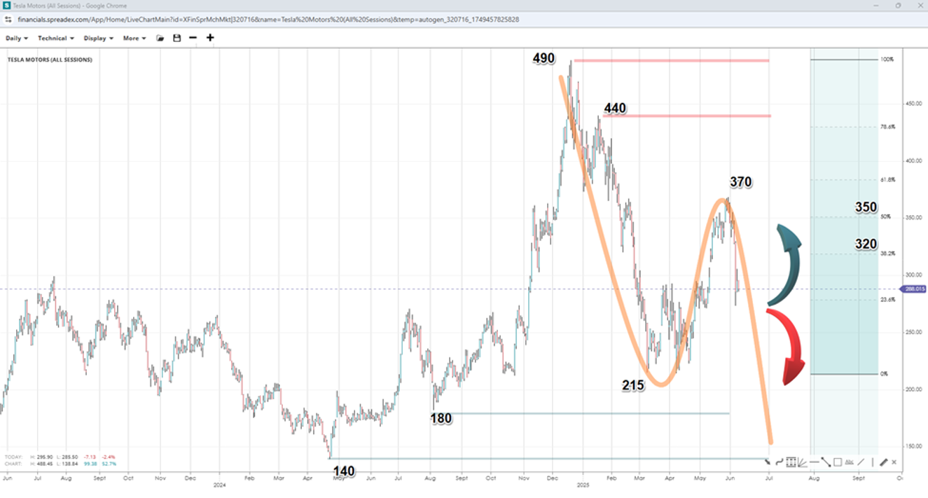 Technically, Tesla has bottomed out at $215 after forming a double bottom pattern in April. However, with prices stalling and reverting near the 50% Fibonacci of the $490-$215 leg at $370, this recovery could be a bull trap. Losing the regional floor would suggest a Dead-Cat-Bounce (DCB) pattern, opening the door to lower prices. Support below the $180 swing sits at the $140 level. To the upside, $320 and $350 appear as short-term resistance levels at the 38.2% and 50% Fibonacci, with a move past the peak invalidating the DCB pattern and eventually exposing $400, $440 and the market top.