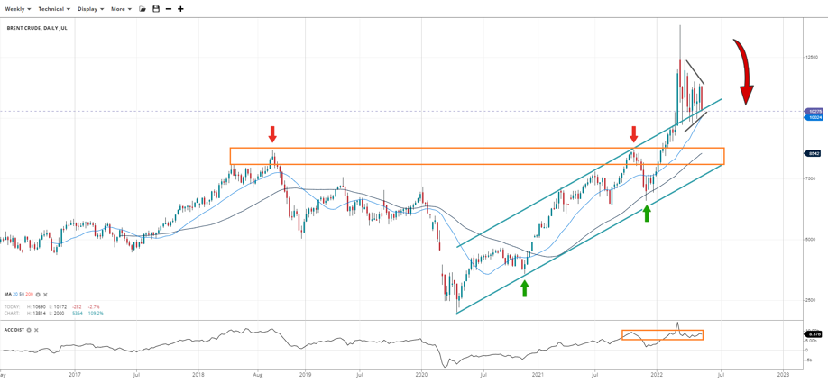 Brent traders have started to distribute since the $13814/t high in March, with the accumulation/distribution line (ACC DIST) reaching levels that had the commodity priced at $85.90 per barrel, but only trading around $102.50 pb now.