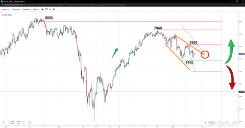 The current structure from April's top at 7940 resembles a broadening wedge with high accuracy, suggesting the drop to 7700 might not be the end of a potential correction forming. This makes record highs possible while implying yet another downward leg below 7700, with a typical target settled by the 100% extension of the preceding move: near 7500. A reversal towards 8k and perhaps fresh record highs could begin once the top trendline breaks and the move above 7820 has more chances to happen.