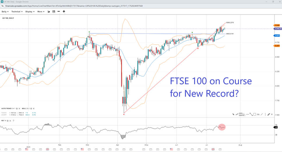 The FTSE 100 has been on an upward trend since the start of the month and is just off the record high scored on Monday. The RSI has yet to reach overbought territory, suggesting the run higher could still have legs. A move above 9000 could meet resistance at the upper Bollinger Band at 9050, with the next resistance level at the 9095 ‘autotrend’ level. On the flip side, a turn towards a correction could encounter support at 8900 and the middle BB range at 8860, followed by the LBB at 8700.
