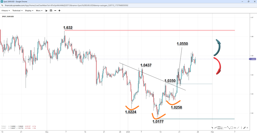 The Fed is expected to keep its interest rates unchanged during its upcoming meeting, while the ECB is widely anticipated to proceed with a 25-basis-point rate cut. Market participants will want to scrutinise policy statements and post-event pressers for insights into future rate moves, which could justify or invalidate the recent price action in EURUSD. The pair has formed a bullish inverse head-and-shoulders pattern, suggesting potential for a reversal if key resistance at 1.0632 is breached.