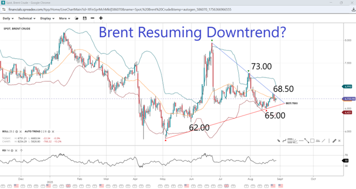 Brent fell 2% to a weekly low on Tuesday as , following the failure to secure a deal between the two countries. The main sticking point appears to be India's refusal to halt its purchases of Russian oil, with US President Donald Trump doubling the tariff rate as part of a pressure campaign aimed at bringing Russia to the negotiating table. All told, Brent prices are 6% lower since the start of the month. Trump also praised the lower crude prices during an open Cabinet meeting on Tuesday, saying he expected prices to move lower soon.