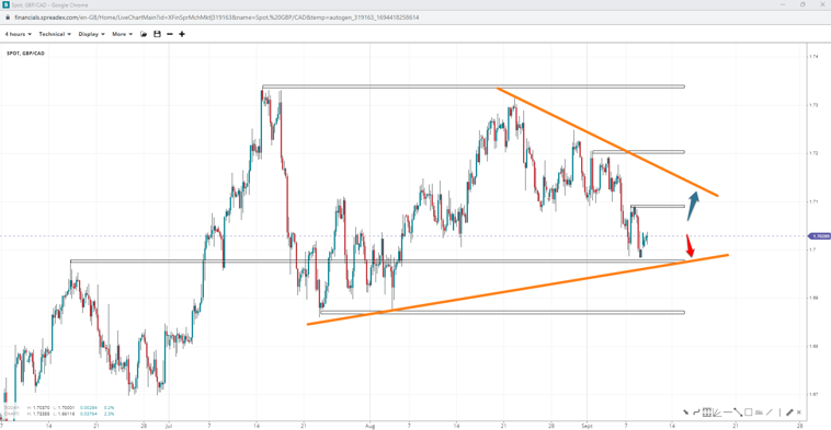 With bulls failing to take over the top of 1.7340 and the short-term resistance at 1.7094, the likelihood of a triangle or range remains high. If bearish action reaches 1.6872, the triangle would be invalidated, whereas a rejection near 1.70 could form a triangle towards or past 1.72.