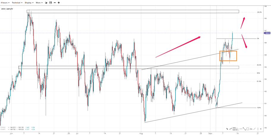 GBP/JPY is in a clear accelerated trend after a pullback back to 164.00 failed to retest 164.30, forming support. Above the local top of 167.00 and 168.00, the pair is poised to revisit the key resistance of 168.70. Lossing the local bottom would open the path to the 38.2%-61.8% zone between 164.15 and 162.80.