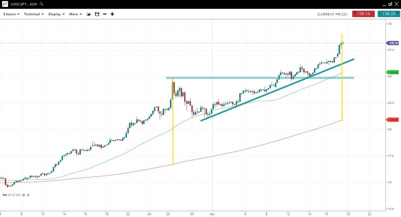 This pair continues to surge higher with any trend following strategy continuing to work in this strong uptrend. It’s of note that the price will be as far above the 200 SMA when it reaches 129 as it was before the last big pullback. A rising trendline offers support before the 125 level.