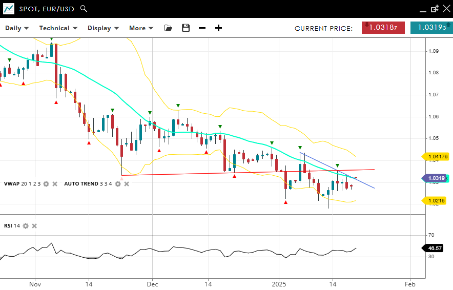 EUR/USD remains in a bearish impulsive phase, trading at 1.0319, just below its VWAP (20) of 1.0310. Support is identified at 1.0216, while resistance is noted at 1.0417. The RSI at 46 reflects continued bearish momentum without immediate oversold conditions.