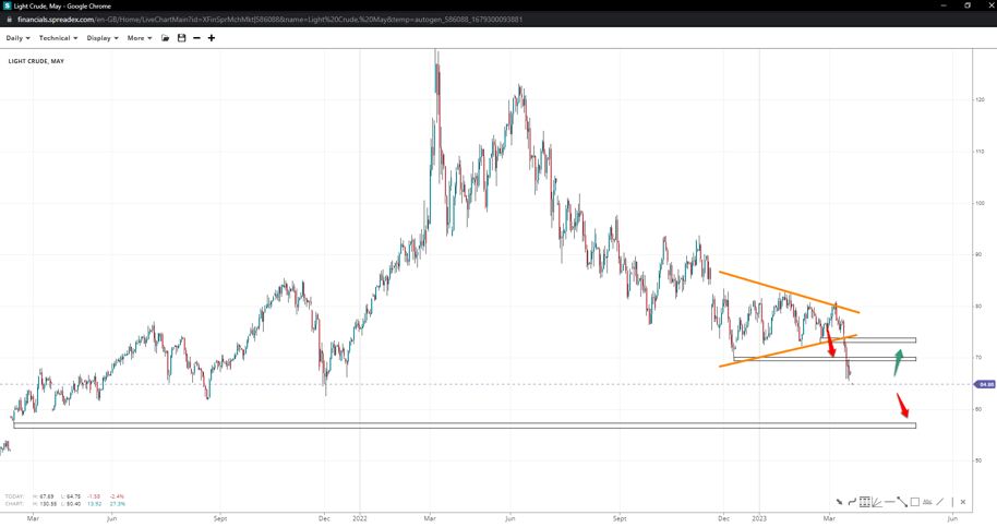 Light crude punched through the low of $70/bbl and retested $65/bbl after breaking outside its triangle pattern. The measured move exposes $60/bbl, where a reversal might be seen. If the floor gives in, $57.40/bbl is the next support. To the upside, the flipped resistance will be hard to recapture, but in the surprising case, it does, $73.75/bbl is unlikely to be hit.