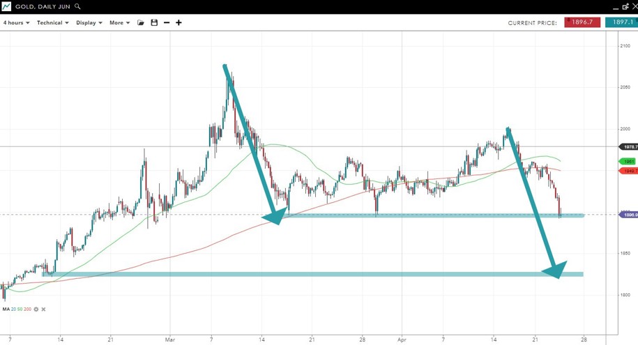 Gold has slumped back sharply from the 2000 level $100 to 1900, which has twice acted as support. Were the price to break lower and make a measured move equivalent to its drop back from the March 8 peak, it would drop towards 1820.