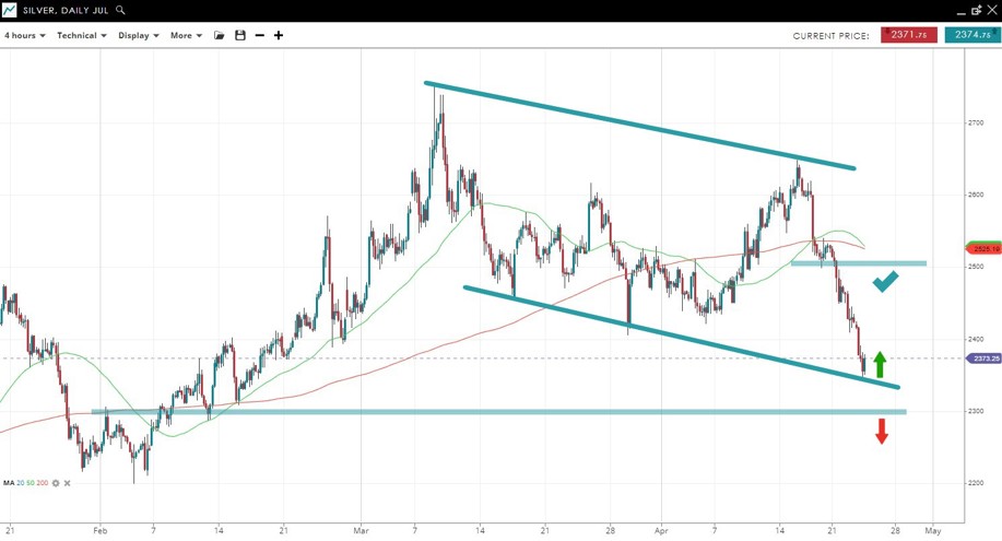 The price of silver has dropped significantly. taking it into a bearish trend. However, the price has paused at the bottom of a down-sloping channel, which could offer some temporary relief, with the 2500 level resistance above. Should the price continue under 2300 it would imply the downtrend will continue.