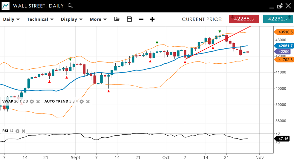 Wall Street is bullish but in a corrective phase. The price is currently 42,290, the furthest it's been below the VWAP (20) of 42,651 since early September. Support is at 41,792, with resistance at 43,510. The RSI is 47, flipping to bearish after a 2-month spell over the 50 level.