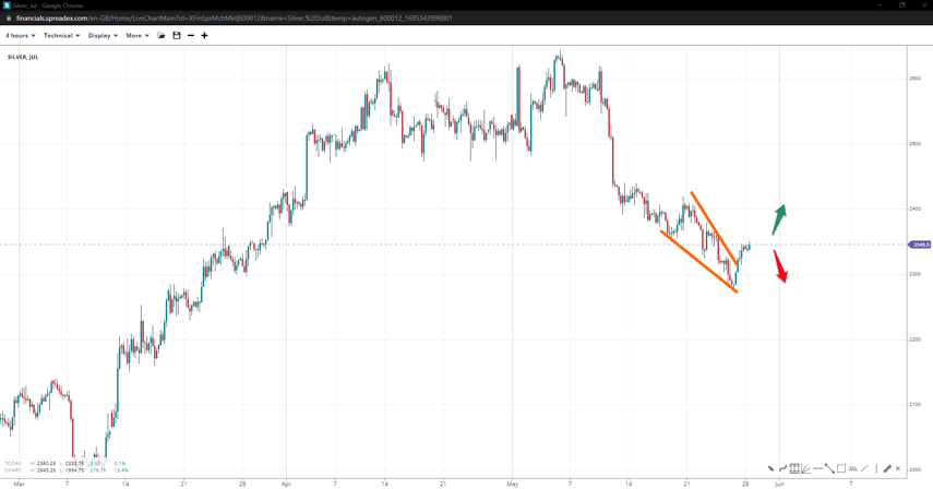 Silver trended lower until it found local support at $22.70 per ounce and bounced but remains at risk of a falling wedge pattern. If prices continue to rise, bulls might encounter the $24 barrier but are unlikely to reach $24.70. Otherwise, if the former support fails, short positions towards $21.50 might be seen instead, provided $22.15 gives way to bears.