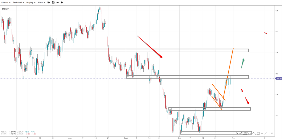 EASYJET broke outside its rising flag after retesting the 308.00 low, with 380.00 on the cards as the measured move from the breakout point upwards. Before there, 348.00 must be recaptured. If bears move past the flipped support, the break below the 300.00 round base will offer a chance at 280.00.