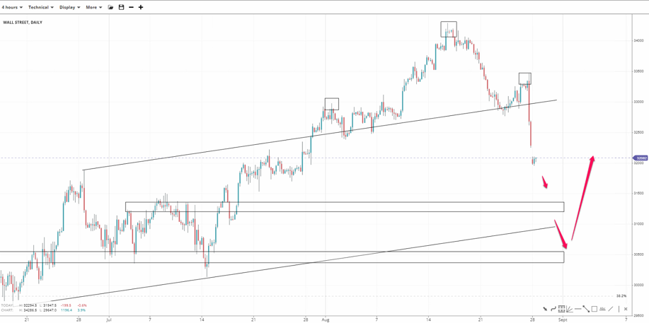 Wall Street slid back into its base channel after forming a head-and-shoulders pattern. Lossing 32,000 might open the door to 31,000 if 31,400 fails to hold. The bottom of the channel is expected to offer support. Inversely, 32,000 firmness could send prices towards 33,000.