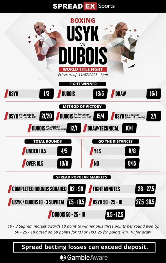 Read on below for Spreadex Sports' 2025 Usyk v Dubois 2 betting preview with the latest odds and spread betting prices* ahead of the massive Undisputed world heavyweight boxing championship rematch between reigning WBC, WBO and WBA champion Oleksandr Usyk of Ukraine against Great Britain's Daniel Dubois, who holds the IBF belt formerly also held by the Ukrainian after his victory over Tyson Fury.