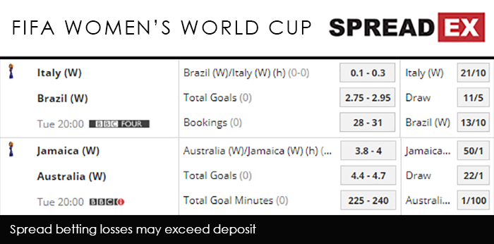 It was a relief, then, that they saw off the Reggae Girlz with ease, a 3-0 win courtesy of Cristiane’s hat-trick. They looked set to continue their strong start in their 2nd game against Australia, with a converted penalty from Marta and another goal for Cristiane giving them a 2-0 lead before the 40 minute mark. Yet Caitlin Foord brought the Aussies back into it with what might as well have been the final kick of the 1st half, planting a seed of doubt heading into the break. That doubt blossomed in the 2nd half, with an equaliser from Chloe Logarzo and an own-goal Monica giving the Matildas a big win. As for Italy, they’ve been something of a surprise. They haven’t even appeared in the World Cup since 1999, and only once have escaped the group stages. And now they’re already in the last-16, with a very late win over Australia and a confident 5-0 thrashing of Jamaica meaning even if they lose on Tuesday they could still top the group. Le Azzure’s luck may run out in Valenciennes, however, with Spreadex offering a Brazil/Italy Goal Supremacy spread of 0.1-0.3, alongside a Total Goals spread of 2.75-2.95. Jamaica vs Australia, 8pm on BBCiWhile it would only take a draw for Australia to confirm their spot in the last-16, they do stand a chance of taking 2nd place – and therefore an ostensibly easier fixture in the next round – if they win big against Jamaica. And that’s eminently doable. So far Hue Menzies’s side have conceded 8 goals in 2 games without responded once, meaning the Aussies could be in for a sizeable boost to their goal difference, as shown in an Australia/Jamaica Goal Supremacy spread of 3.8-4 and a Total Goals spread of 4.4-4.7.