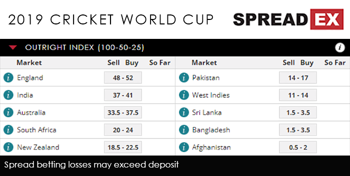 Clearly benefiting from the home advantage, England top Spreadex’s Outright Index with a spread of 48-53, where the winner gets 100 points, the runners-up 50 points, the losing semi-finalists 25 points and those left behind in the group stage a big fat 0. That is maybe something of a surprise given that they lost their warm-up fixture against defending champions Australia by 12 runs last Saturday. The Aussies themselves have an Outright Index spread of 33.5-37.5, also behind India’s 37-41. South Africa then round out the most likely semi-finalists, with a spread of 20-24, followed by 2015’s beaten finalists 18.5-22.5, and Pakistan at 14-17. The tournament opens with a tasty little tête-à-tête between England and South Africa on Sky Sports Cricket. The hosts are expected to leave the Oval with a potentially crucial 2 points this Thursday, with Spreadex offering an England/South Africa Supremacy spread of 21-31, alongside an England to win match spread of 66.6-71.5. Slightly less exciting is Friday’s second fixture between the West Indies and Pakistan. The latter have had a terrible warm-up, losing 4 times against England and once against Afghanistan, but are still fancied to win, at a Pakistan/West Indies Supremacy spread of 0-10.