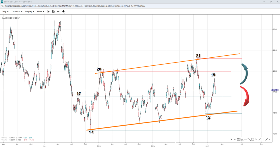 Barrick Gold has recently accelerated from the lower end of a flag-like channel at $15, suggesting a continuation towards the upper channel resistance at $21 if bulls reclaim the $19 regional peak. However, the stock might face potential risk at the upper channel. On the downside, a drop under the support at $15 could result in a move to $13.