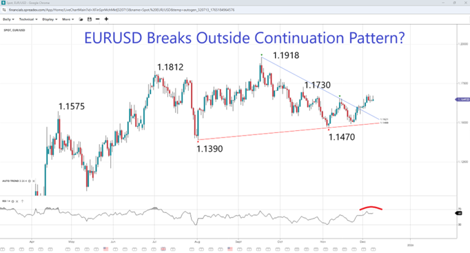 But the Fed isn't the only factor affecting the greenback, of course. Last week saw another batch of delayed official data showing market weakness. On top of that, post-shutdown data has started to come out, notably with ADP dropping into -35K job losses, suggesting the US economy is weakening. The official November NFP is now scheduled for next week, long after the Fed has made its policy decision. Part of the weakness can also be explained by the euro, which accounts for 58% of the dollar index basket, which Stronger-than-anticipated business activity in the Eurozone, which reached 30-month highs, has made European assets more attractive as the ECB is set to keep its policy unchanged when markets anticipate another 100 basis points of easing from the Fed next year.