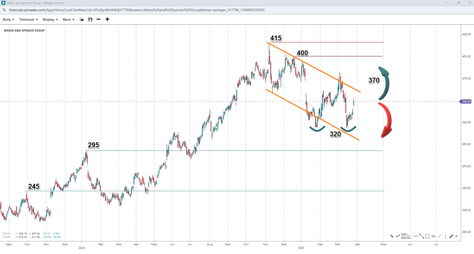 M&S, in fact, shows a double bottom around the 320 GBX level following the likely completion of a flag pattern. With the downward-sloping trendline near 370 GBX acting as a dynamic resistance, a breakout higher could pave the way for a move towards 400 GBX and the recent peak of 415 GBX. Conversely, if the trendline rejects bulls, a channel or descending triangle may form instead, exposing M&S to declines towards 295 GBX, with potential extensions eyeing 245 GBX.