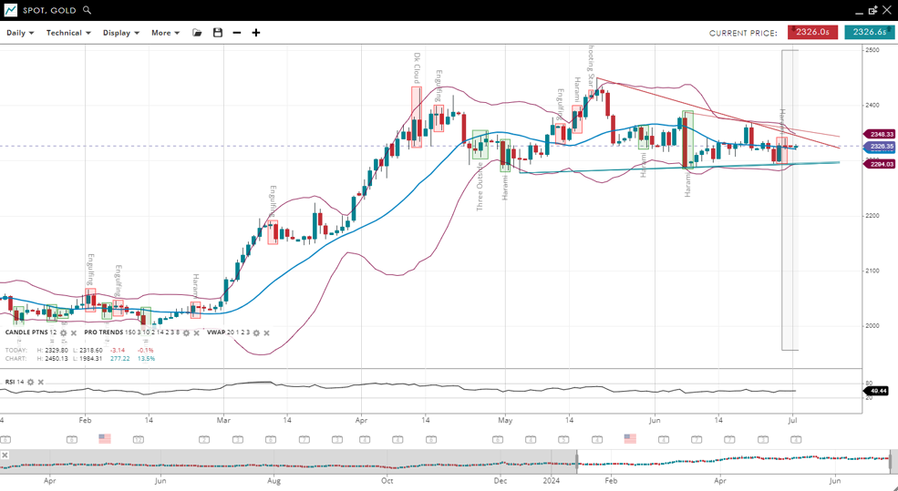 Gold remains in a bullish trend trading sideways in a neutral consolidation since topping in mid-April, with the price recently increasing to 2,326, now around the previous VWAP of 2,325. Support has adjusted higher to 2,294, while resistance has decreased to 2,348. The RSI remains at 49, indicating a continuation of moderate momentum compared to the previous report.