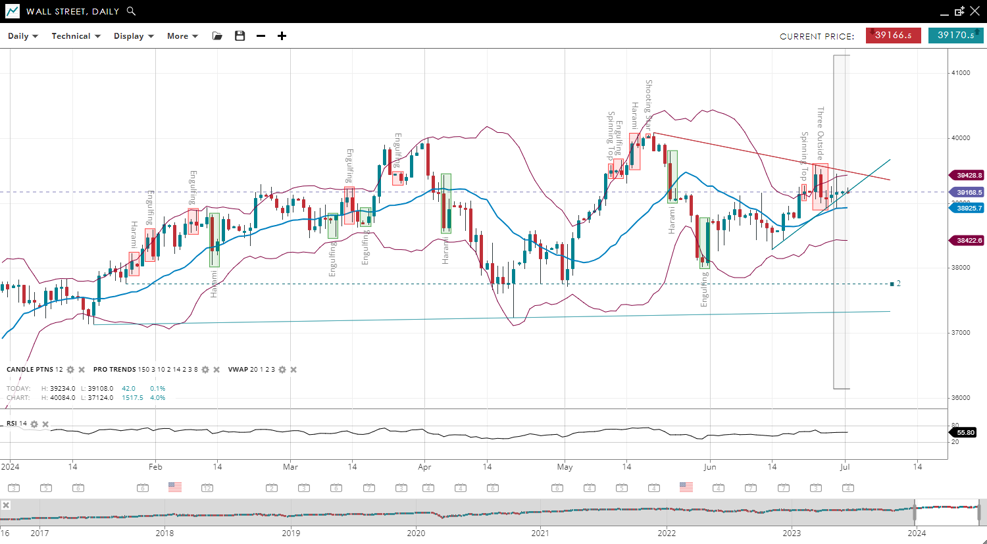 | Wall Street | Bullish | Consolidation | 39168 | 38925 | 38422 | 39428 | 55 |