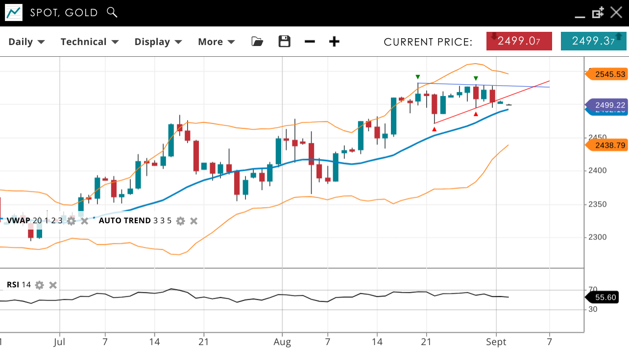 Gold remains firmly in a bullish trend, in an impulsive phase as it sits near a record high. The price is slightly lower at 2,499, hovering around the VWAP of 2,495. Support has been adjusted to 2,438, with resistance at 2,545. The RSI has moderated to 55, indicating slightly cooling bullish momentum.
