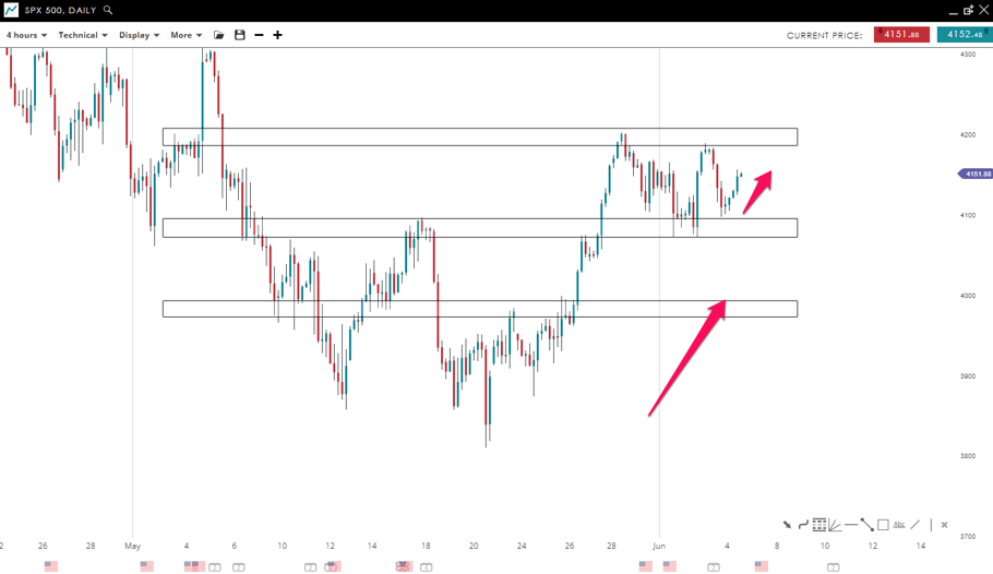 The bulls showed strength by pushing the price higher since the end of May. The index breached the bullish flag to the upside after posting a higher low on June 4. If the current 4-hour bar closes above the 7,625 mark, this could lead to a further move to the upside toward the 7,680 level.