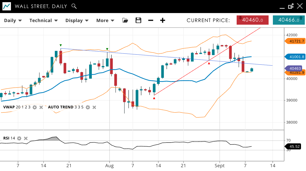 Wall Street is in a bullish trend, though in a corrective phase after last week’s steep sell-off - the worst this year. The price is 40,463, below the VWAP of 41,001. Support is at 40,281, and resistance is at 41,721. The RSI of 45 suggests moderate bullish momentum.