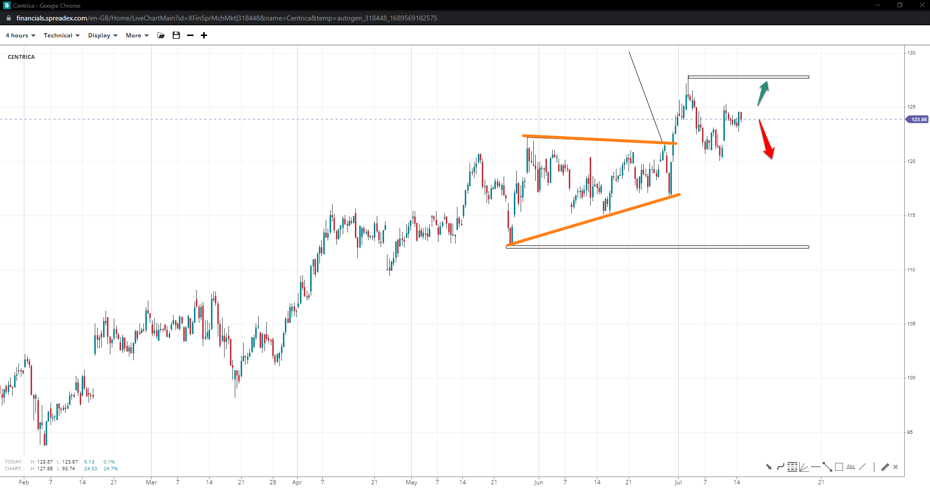 Centrica has ended an ascending triangle at 117p, with chances of hitting the measured-move target of 130p high above 120p. Losing the triangle low might end the upside trend, pressuring the stock to 112p.