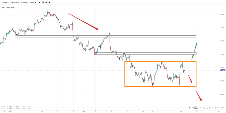 Wall Street turned sideways following a rally from 28700 to 30500, with the low back in focus. The 30k handle is a short-term ceiling, and the 29500 is a floor. Losing the range low exposes 28000, whereas a breakout from the top opens the door to 32300 and 31000 turns to support.