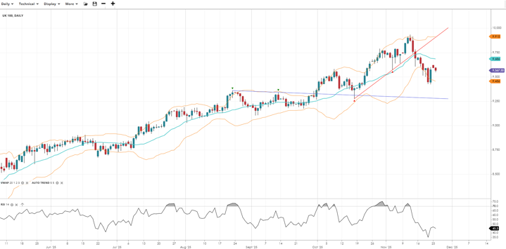 UK 100 continues to trend bullishly but has entered a correction phase. Price is at 9,567, beneath the VWAP of 9,686. RSI at 45.3 reflects neutral to soft momentum. Support is 9,456, with resistance at 9,915.