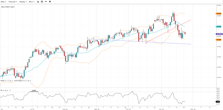 Wall Street remains bullish but is now in a correction phase, trading at 46,237 under the VWAP at 46,953. RSI at 42.2 suggests weakening momentum and potential for deeper pullback. Support is at 45,684, resistance at 48,223.