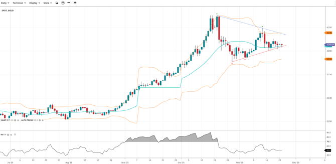 Gold remains in a correction of its bullish trend, trading at 4,069 just above VWAP of 4,068.94. The correction is contracting, which will lead to a resumption of the trend or an extended correction. RSI at 51.0 indicates balanced momentum. Support is 3,916 with resistance at 4,196.