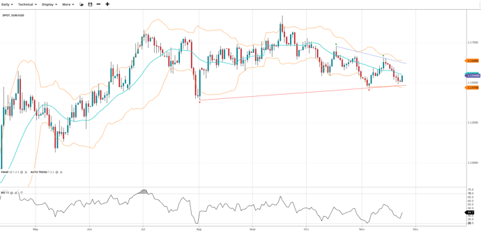 EUR/USD continues in a bearish leg of an otherwise neutral market, having not broken down past major support. The price is 1.1548 right at the VWAP. RSI at 44.7 indicates ongoing indecision. Support sits at 1.1470, resistance at 1.1638.