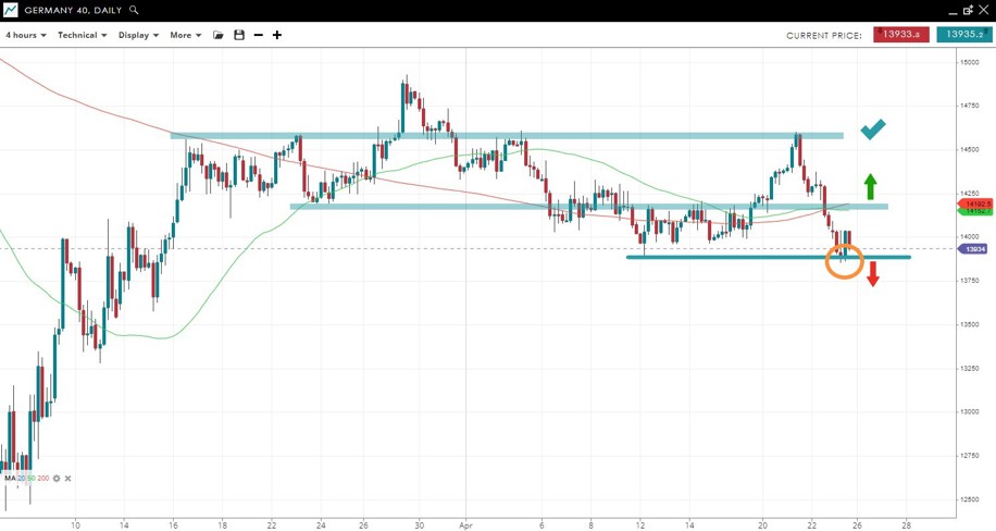 The successful test of the April 12 low shows some relative strength vs other indices so - if there is a rebound - this index could be an outperformer with a possible re-test of last week’s top near 14,600 should the price make it back over 14,200. A close under 14,000 would negate any bullish possibility.