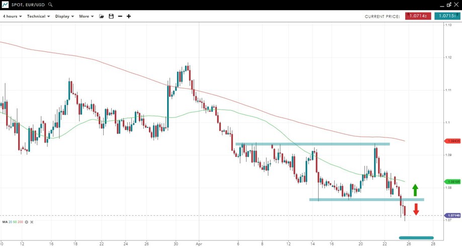 The price hit a near-perfect 2-year low from the low of April 24, 2020, after breaking down from the 1.076 support, which is now resistance. The major multi-year low from March 2020 is just below at 1.0637.