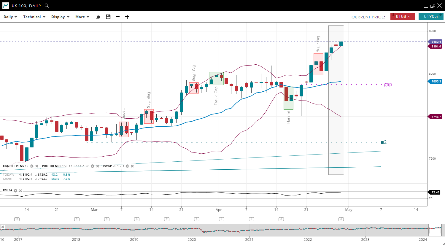 | UK 100 | Neutral | Consolidation | 7,986 | 7,913 | 7,836 | 7,986 | 62 |