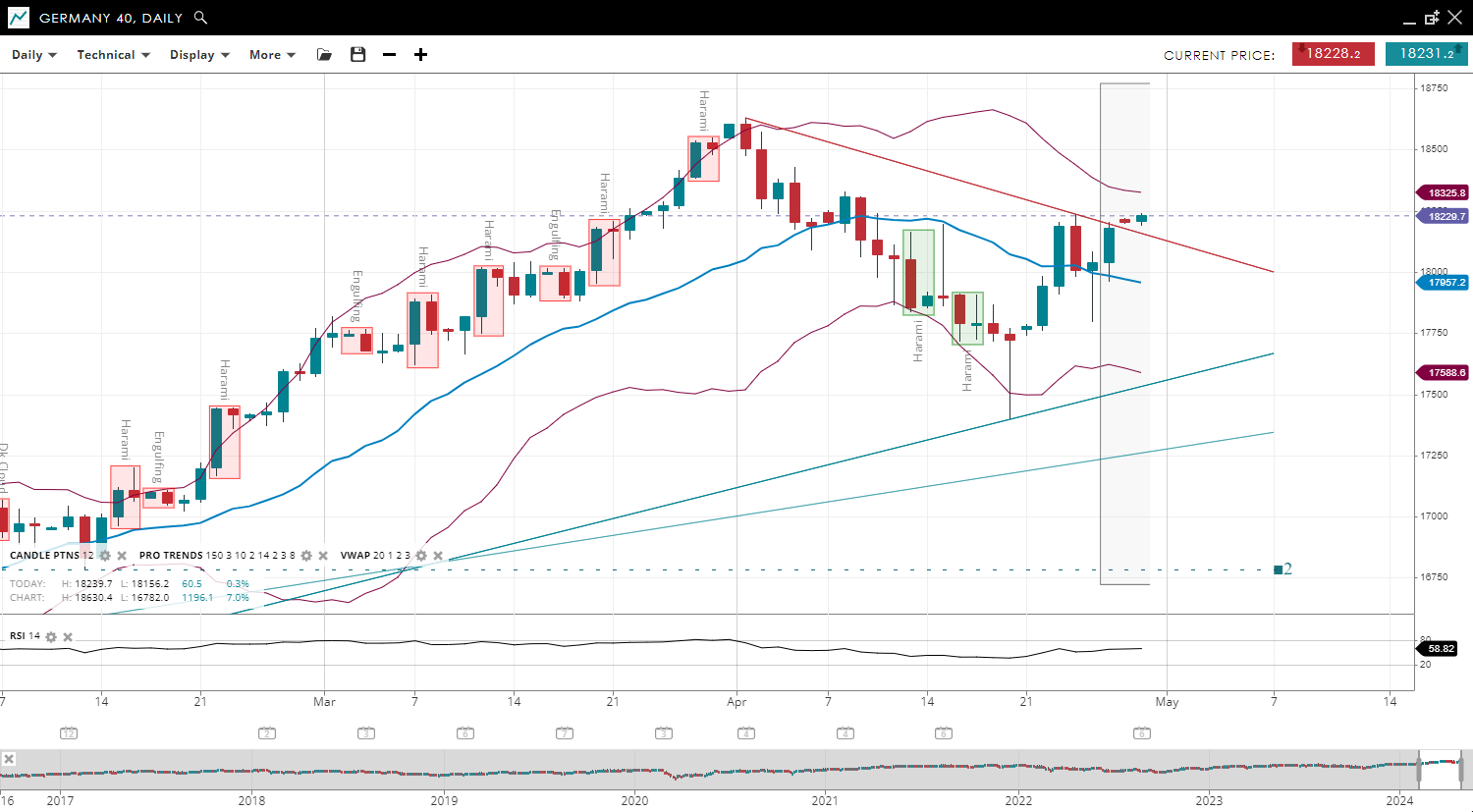 | Germany 40 | Bearish | Impulsive | 17,827 | 18,013 | 17,499 | 18,564 | 42 |